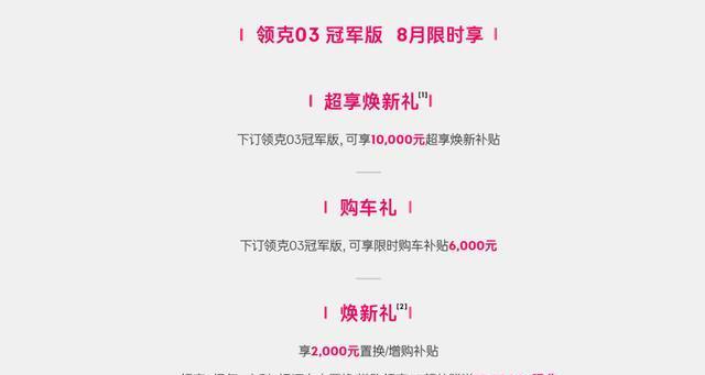 根据公告信息,领克 03 智能版计划于 10 月中下旬正式上市。考虑到新车在智能硬件和动力系统上的升级,其售价很可能高于现款基础版车型。对于那些对辅助驾驶功能有较高需求的消费者来说,等待智能版上市是合理的选择,因为新增的硬件配置能够带来实实在在的使用体验提升,满足其对车辆智能化的需求。与此同时,现款领克 03 车型迎来了购车的优惠时机。目前,现款车型推出了多项限时福利政策:冠军版可享受 10000 元焕新补贴和 6000 元限时购车补贴;在选装配置方面,选装 AR-HUD 和运动升级包可立减 2000 元。对于近期有购车计划,且对辅助驾驶功能需求不迫切的消费者而言,现在入手现款车型能够获得更实惠的购车价格。